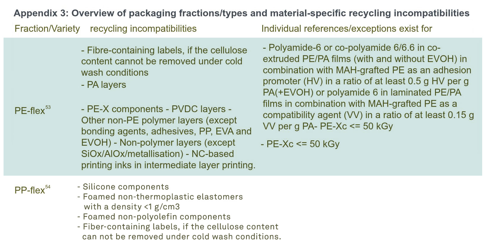 Due to the high demand for homogeneous granulate quality in blown film extrusion, PP content in PE-flex is completely deducted when assessing recyclability. PE content in PP, on the other hand, is fully credited as a recyclable material.